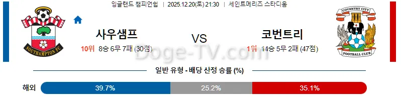 12월20일 사우샘프턴 코번트리 시티 해외축구분석 스포츠무료중계 스포츠분석