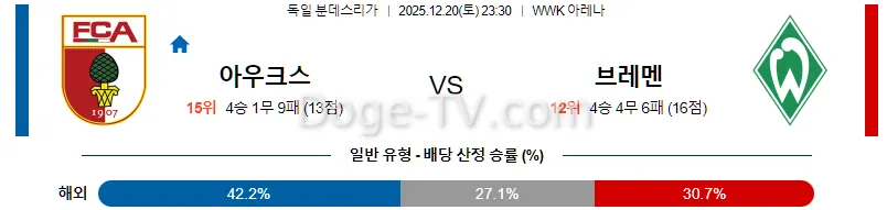 12월20일 아우크스부르크 SV 베르더 브레멘 해외축구분석 스포츠무료중계 스포츠분석