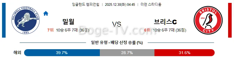 12월30일 밀월 FC 브리스톨 시티 FC 해외축구분석 스포츠무료중계 스포츠분석