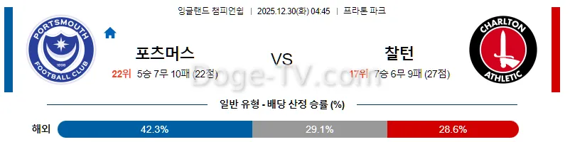 12월30일 포츠머스 FC 찰튼 해외축구분석 스포츠무료중계 스포츠분석