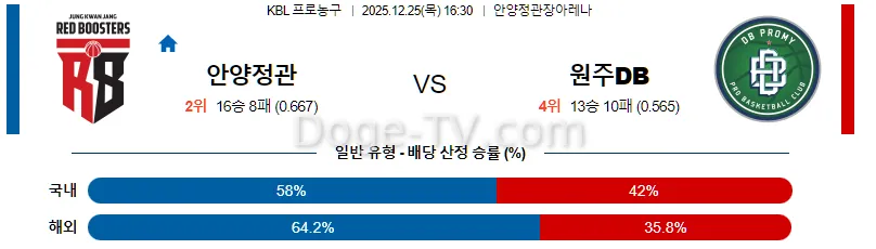 12월25일 안양 정관장 원주 DB 국내농구분석 스포츠무료중계 스포츠분석