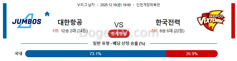 12월19일 대한항공 한국전력 국내배구분석 스포츠무료중계 스포츠분석