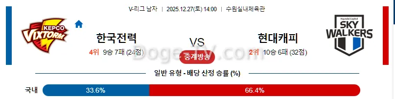 12월27일 한국전력 현대캐피탈 국내배구분석 스포츠무료중계 스포츠분석
