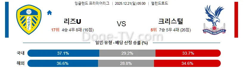 12월21일 리즈 유나이티드 FC 크리스탈 팰리스 스포츠무료중계 스포츠분석