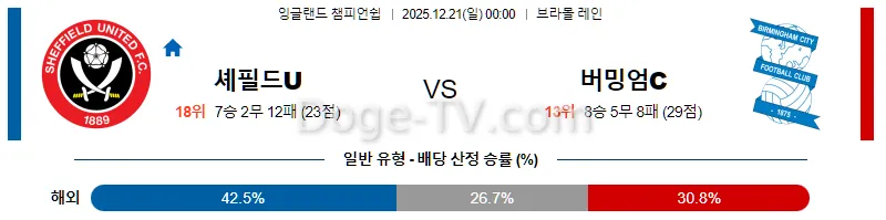 12월21일 셰필드 유나이티드 버밍엄시티 해외축구분석 스포츠무료중계 스포츠분석
