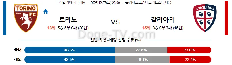 12월27일 토리노 FC 칼리아리 칼초 해외축구분석 스포츠무료중계 스포츠분석