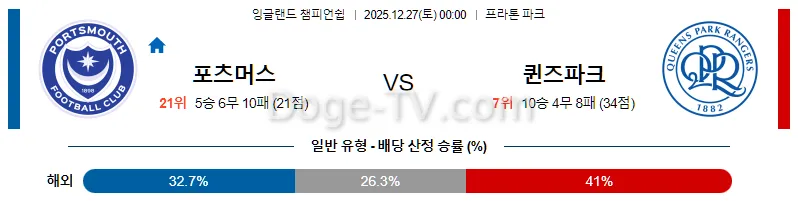 12월27일 포츠머스 FC 퀸즈 파크 레인저스 해외축구분석 스포츠무료중계 스포츠분석