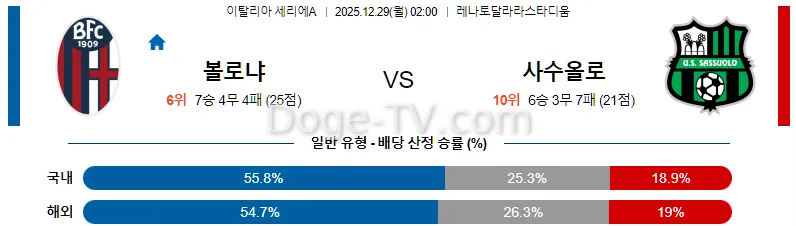 12월29일 볼로냐 FC 사수올로 해외축구분석 스포츠무료중계 스포츠분석