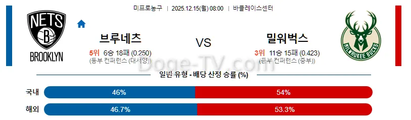 12월15일 브루클린 네츠 밀워키 벅스 NBA 스포츠무료중계 스포츠분석